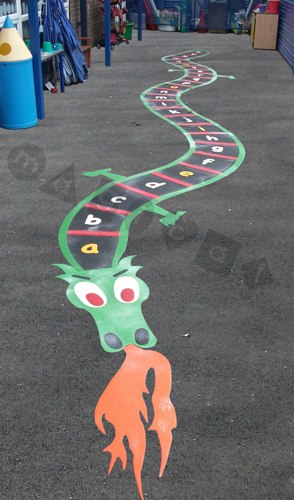 This playful snake is installed in thermoplastic material divided into 26 section plus its head. Each segment is roughly 400mm and contains a lower case letter. Consonants are one colour and vowels another. Many games can be played on this snake, it's energetic and educational and can be played with several children or just one child jumping along. Try hopping on one leg into the letters, then the other leg. Try jumping only on letters that spell your name out?