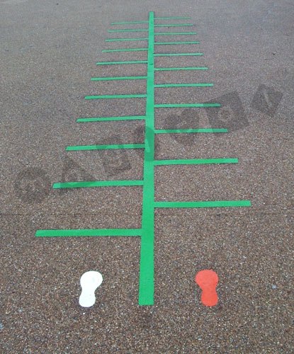 Designed in a ladder format on two sides of a long 6.25mtr line of green thermoplastic with two shoe prints of different colours to denote different teams. This ladder can be used for many games, for both sport and PE.