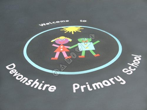 This 3 mtr diameter circle has two little children in the centre holding hands. This is a sign that can be placed at the entrance to the school or playground and the school name can be placed around the marking at an extra cost in 150mm high lettering.